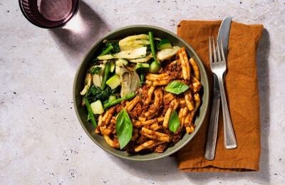 Beef mince slowly cooked in a vibrant tomato sauce and vegtables, tossed togheter with penne pasta and basil leaves.